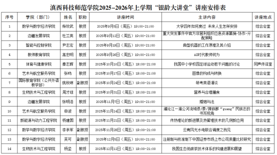 经我校二级学院申报,教师中心统筹,2025-2026上学期计划开展“银龄大讲堂”14讲,欢迎学校广大师生积极参与。讲座计划如下:
